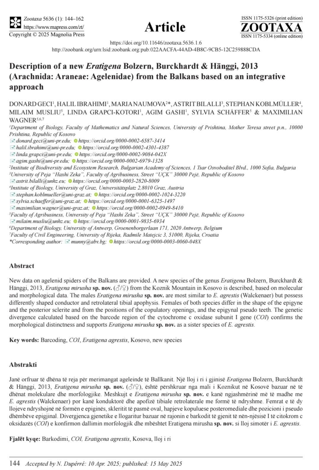 A new spider species, Eratigena mirusha, has been formally described and published in the internationally recognised scientific journal Zootaxa, marking an important contribution to biodiversity research in Kosovo.